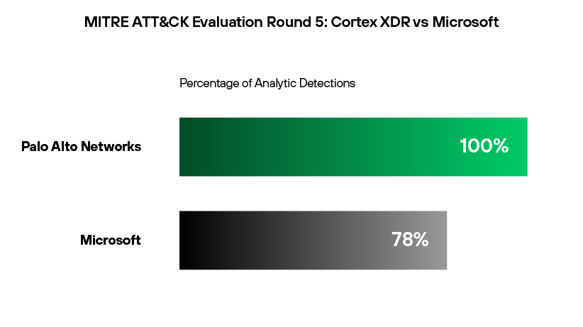 O Microsoft Defender XDR não atende aos requisitos de alta visibilidade e detecção necessários para a defesa eficaz contra os atuais agentes de ameaças apoiados pelos Estados-nação. Nas avaliações ATT&CK da MITRE de 2023 (Turla), que compararam os produtos EDR com implantes de rede e backdoors usados pelo Serviço Federal de Segurança da Rússia, a Microsoft registrou uma taxa de detecção analítica de 78,3%, em comparação com a taxa de detecção analítica de 100,0% do Cortex XDR. A taxa de detecção da Microsoft significa que 21,7% das subetapas executadas por essas ferramentas cibernéticas não resultaram em uma detecção de endpoint, enquanto o Cortex XDR detectou todas as subetapas.