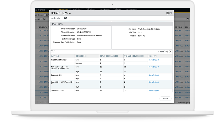 Entregue por meio de firewalls PA-Series, o DLP empresarial inspeciona o tráfego da web para detectar, monitorar e proteger automaticamente os dados confidenciais em movimento